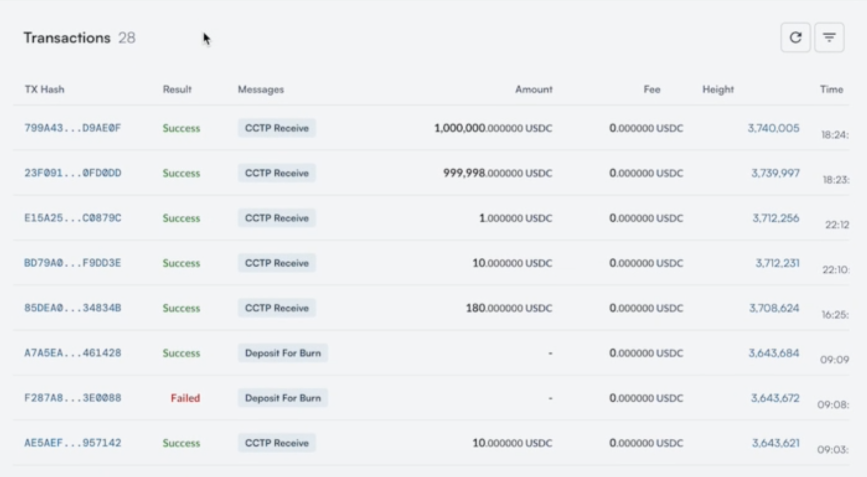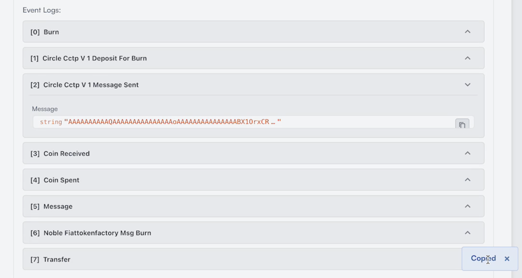 Next, you will want to expand the event log and copy string for the sent message. This message is emitted by the CCTP module on Noble. Since Noble is a Cosmos chain, and all Cosmos chains encode messages in Base64, this string needs to be decoded to Hex to be compatible with Ethereum. Copy this message.
