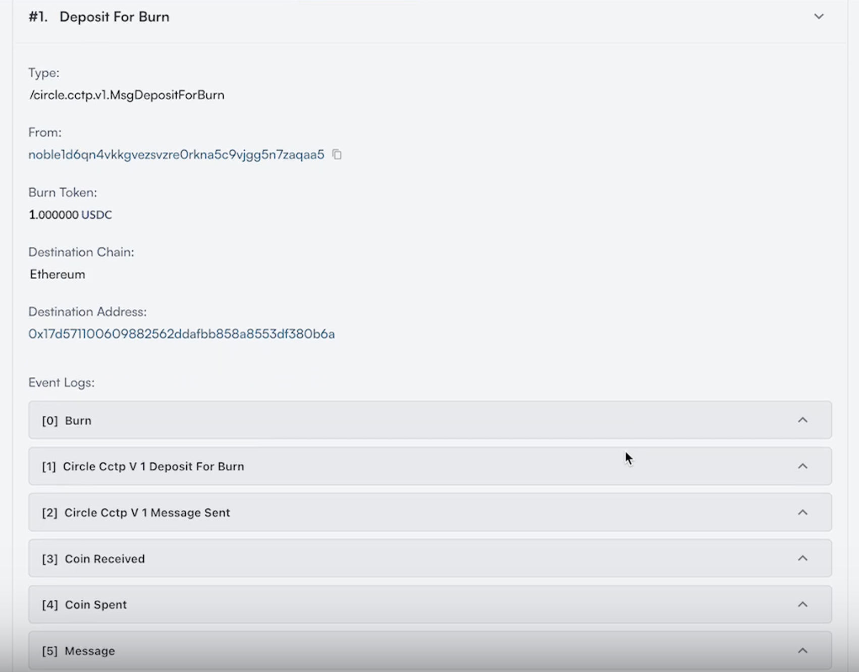Once you find the transaction in question, you will want to inspect the event logs of the Deposit for Burn transaction. This is the information you will use to fetch the attestation signature when the transaction was verified by Circle. Look for [2] Circle CCTP V1 Message Sent.