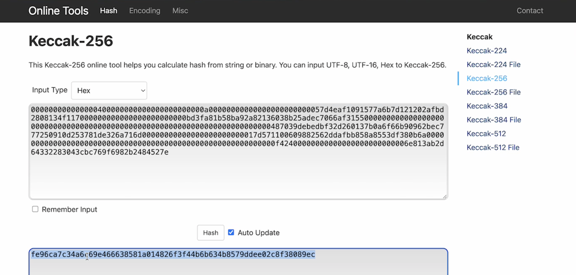 First, change the input type from UTF-8 to Hex and paste in the bytes. Copy this hash.