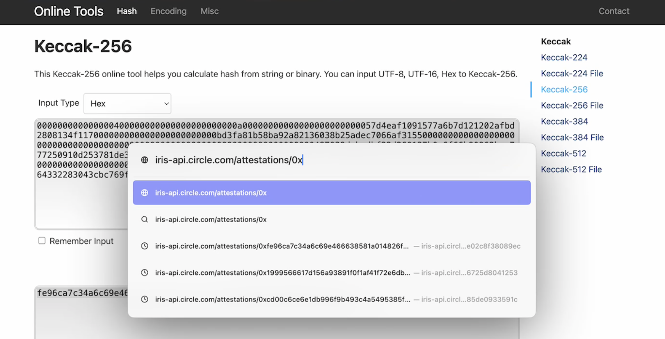 With this hash, you can now fetch the attestation. Go to https://iris-api.circle.com/attestations/ and at the end of this address add a 0x and copy the hash and enter this URL into your browser.