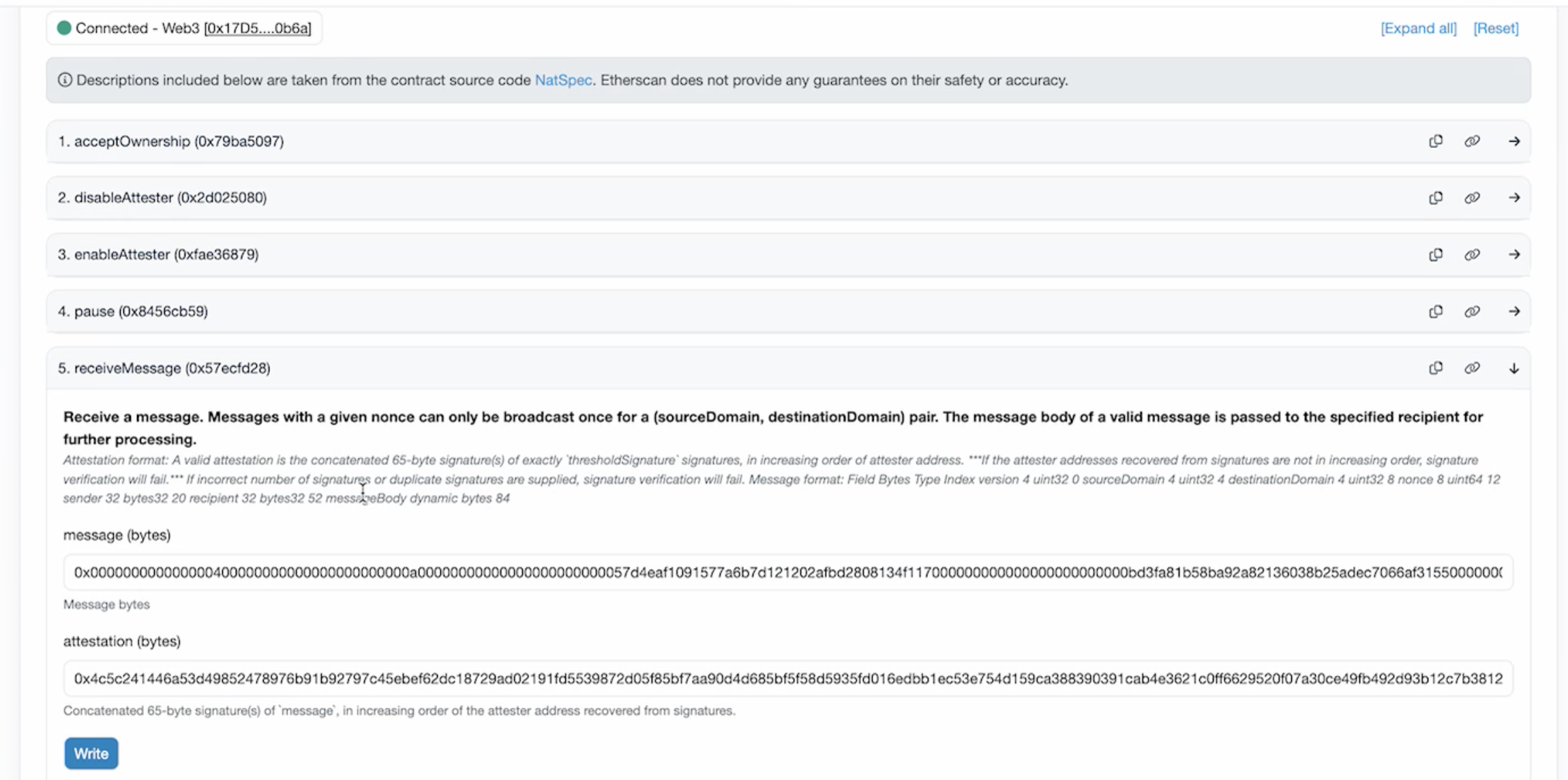 Go to the MessageTransmitter contract on Etherscan. This smart contract is used to send and receive all CCTP transactions. You can find the specific link to the contract for your destination chain from Circle’s documentation.