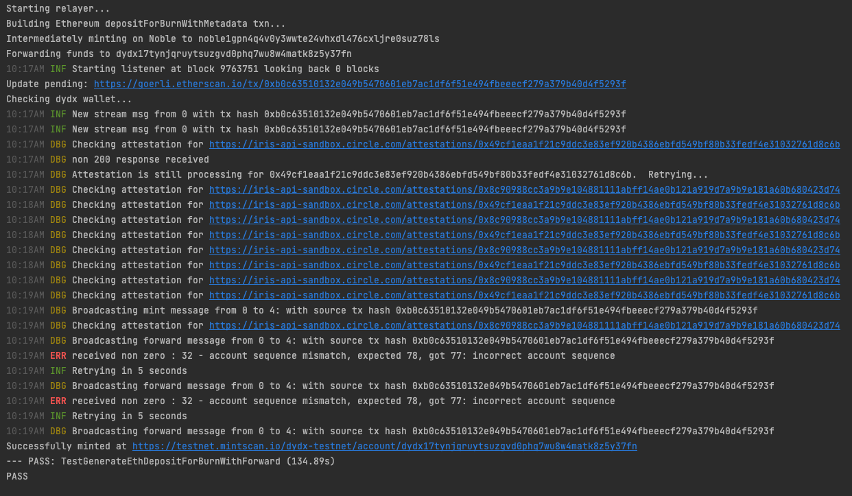 - CCTP relayer broadcasts the messages and attestations to Noble